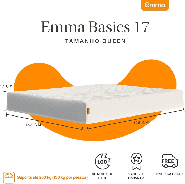 Colchão Queen Emma Basics 17 cm - 158x198 cm Espuma D28 17cm com Tecnologia Alemã, Firmeza Ideal, Suporte Confortável, 100 Noites de Teste e 5 Anos de Garantia