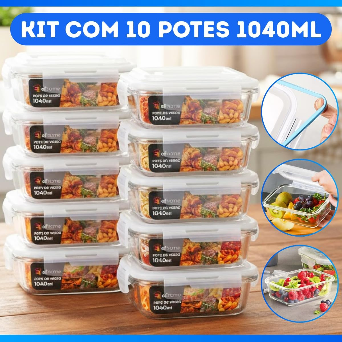 🔥 KIT 10 Potes de Vidro Retangular com Tampa Hermética 1040ml Cor: Transparente 💸 Apenas R$ 22,66 😱